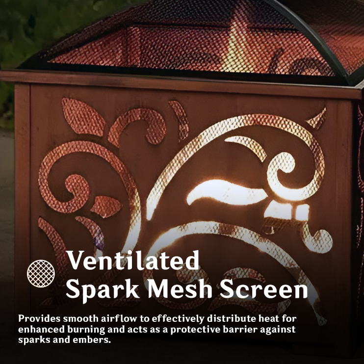 - VENTILATED MESH DESIGN AND LARGE SPARK SCREEN: The fire pit features a ventilated mesh design and a large spark screen on the inside of the grill. This design provides abundant airflow for a stronger wood-burning fire while effectively containing sparks and embers, ensuring safety during use.