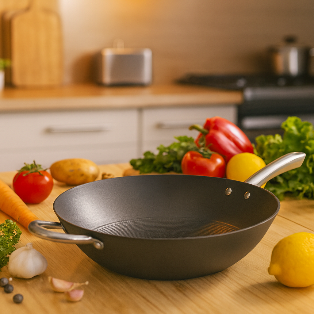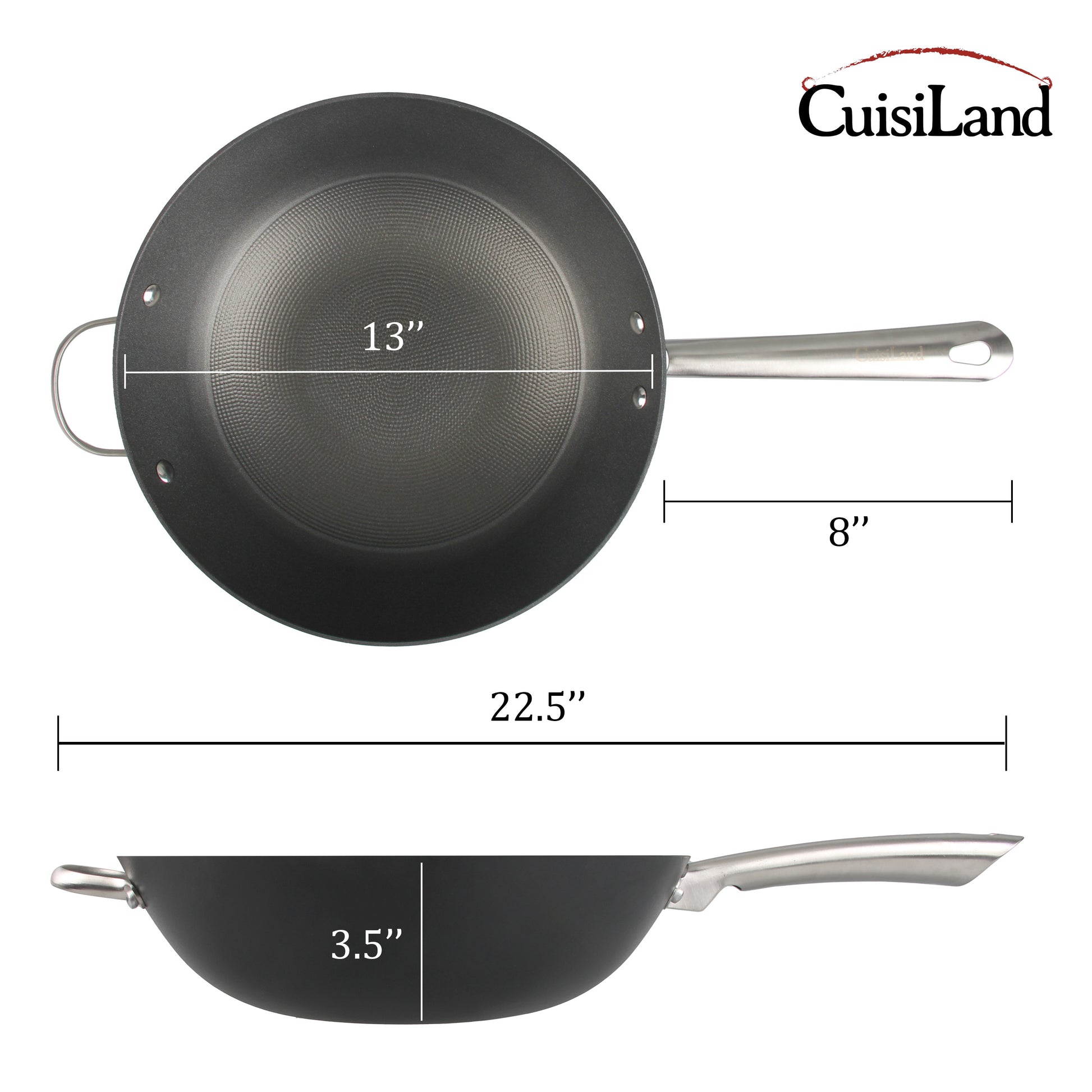 - 12.5” Diameter | 3.5” Depth | 8” Long Handle | 22.5” Overall Length – Large-capacity wok designed with two sturdy handles for easy lifting and control. Ideal for stir-frying, sautéing, searing, and light braising. Perfect for preparing family-sized meals or entertaining guests with flavorful Asian-inspired dishes.
