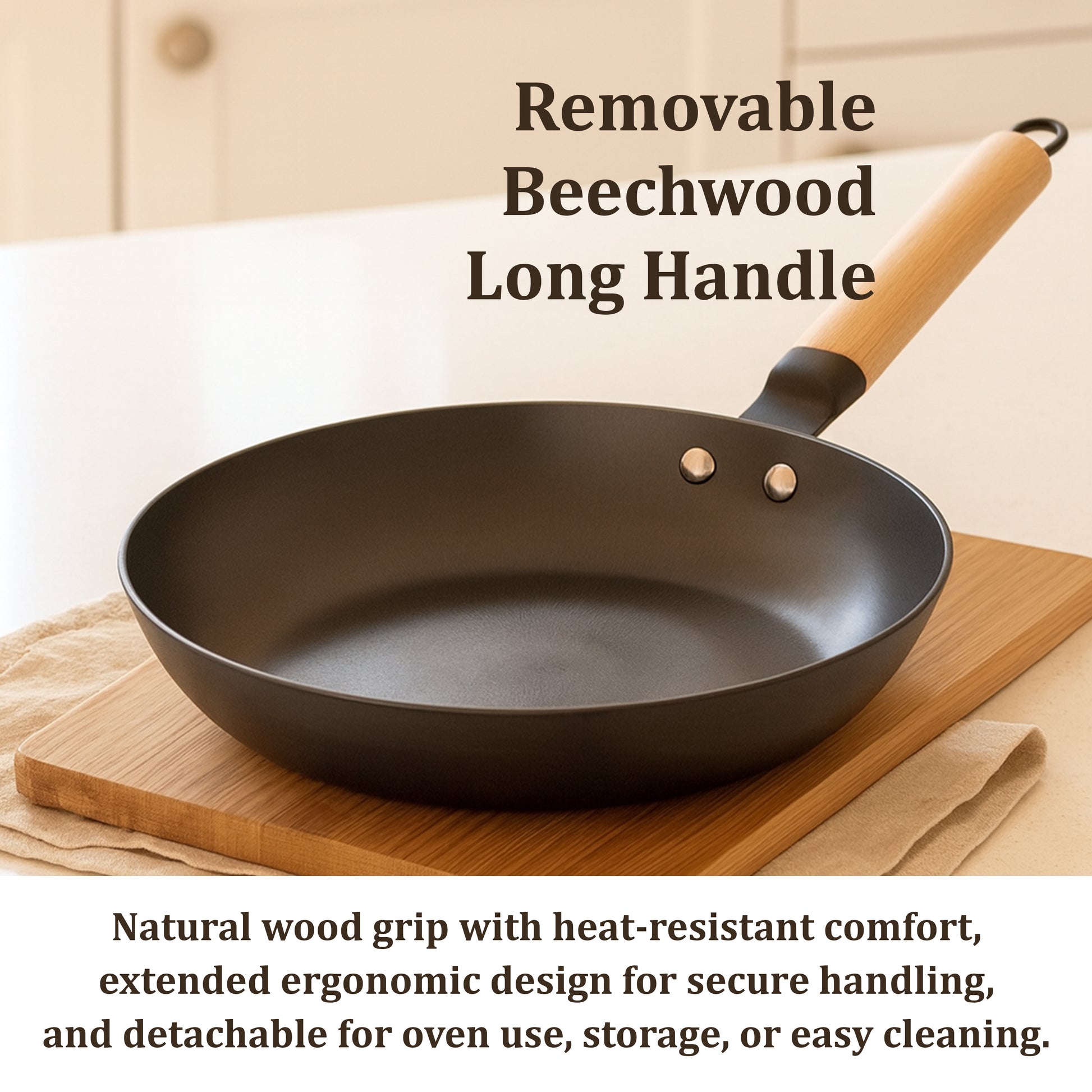 - ERGONOMIC NATURAL BEECHWOOD HANDLE – Crafted from solid beechwood, the handle stays cool longer on the stovetop, offers a comfortable non-slip grip, and is double-riveted for lasting stability with a stylish, natural finish.