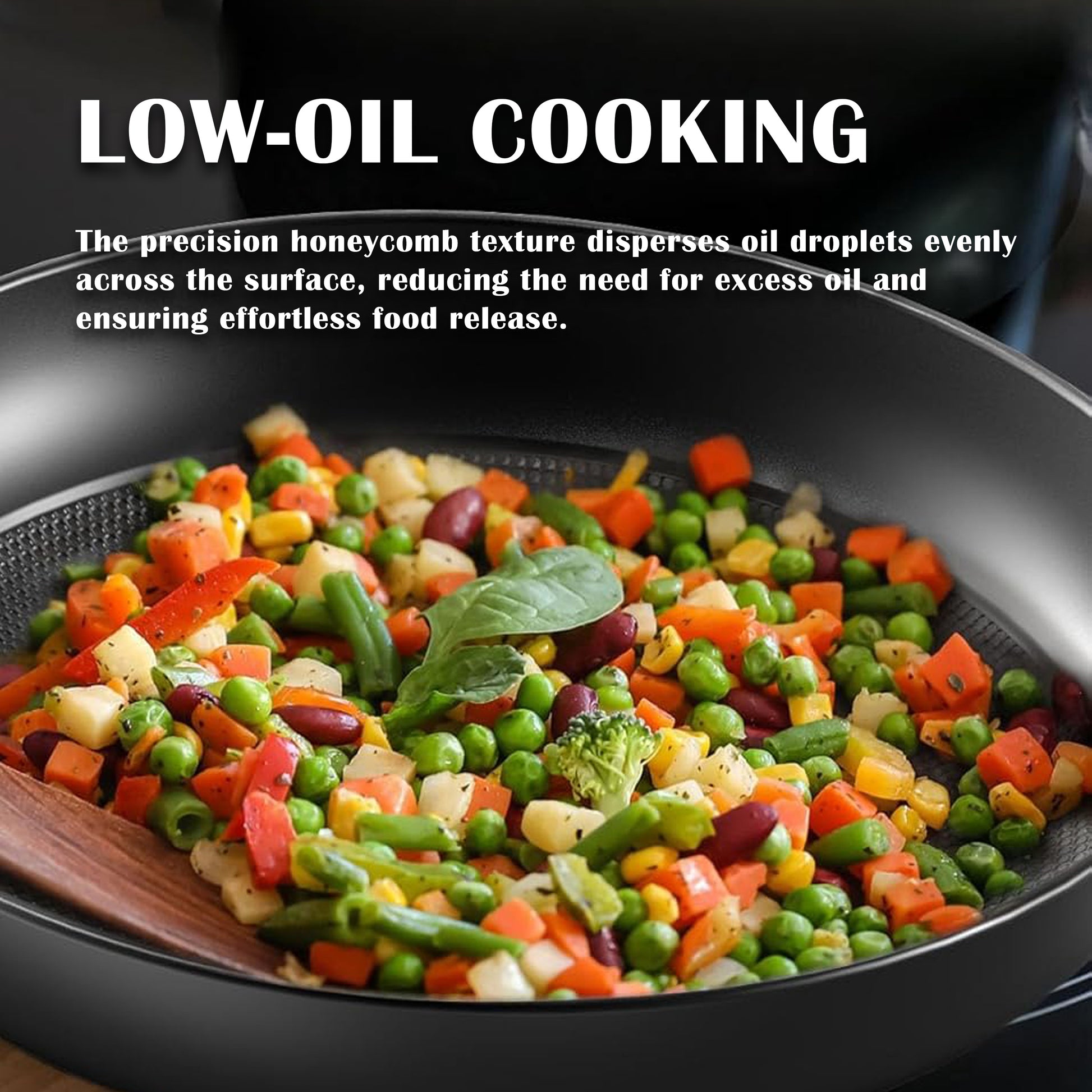 - HONEYCOMB CERAMIC COATING FOR LOW-OIL COOKING – The precision honeycomb texture helps disperse oil droplets evenly across the pan’s surface, reducing the need for excess oil and ensuring effortless food release. Perfect for frying eggs, searing meat, or sautéing vegetables without sticking.