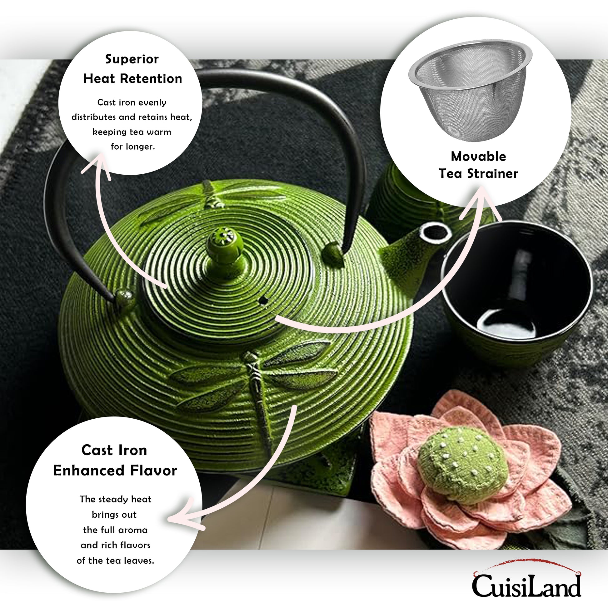 - HANDCRAFTED TEAPOT SET: This exquisite teapot set includes an 800ml (27oz) cast iron teapot with a dragonfly design, a stainless steel mesh infuser, a matching trivet, and two 120ml (4oz) matching cups, all beautifully packaged in a gift-box.